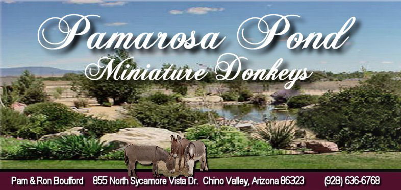 Welcome to PAMAROSA POND MINIATURE DONKEYS, owned and operated by Pam and Ron Boufford in Chino Valley, AZ . We are located in beautiful central Arizona, in a growing farm community 16 miles north of historic Prescott,AZ and 85 miles from Flagstaff, AZ.